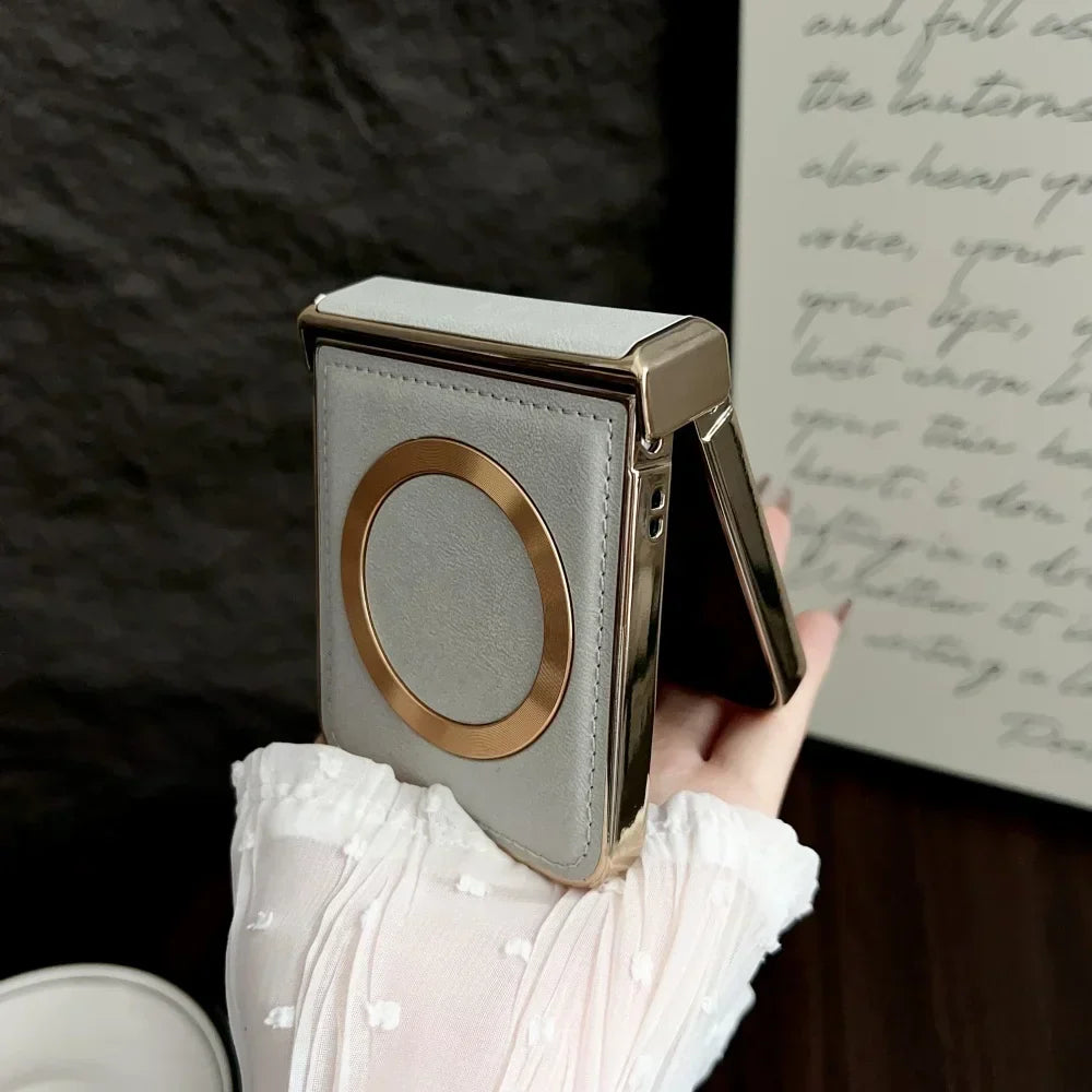 Z Flip 7 Leather Ring Case with Kickstand, Magnetic MagSafe, Tempered Glass Protector, Wireless Charging Compatible