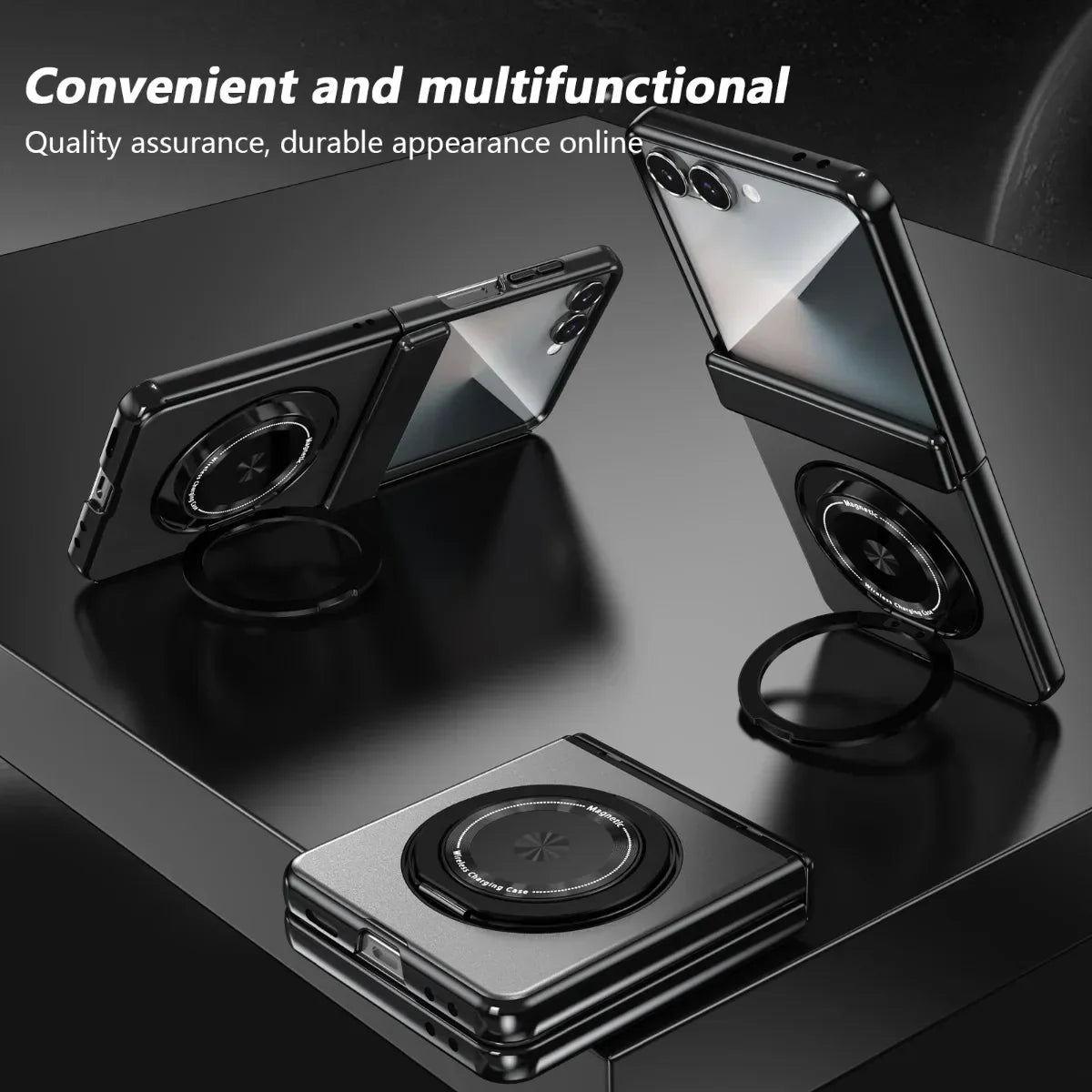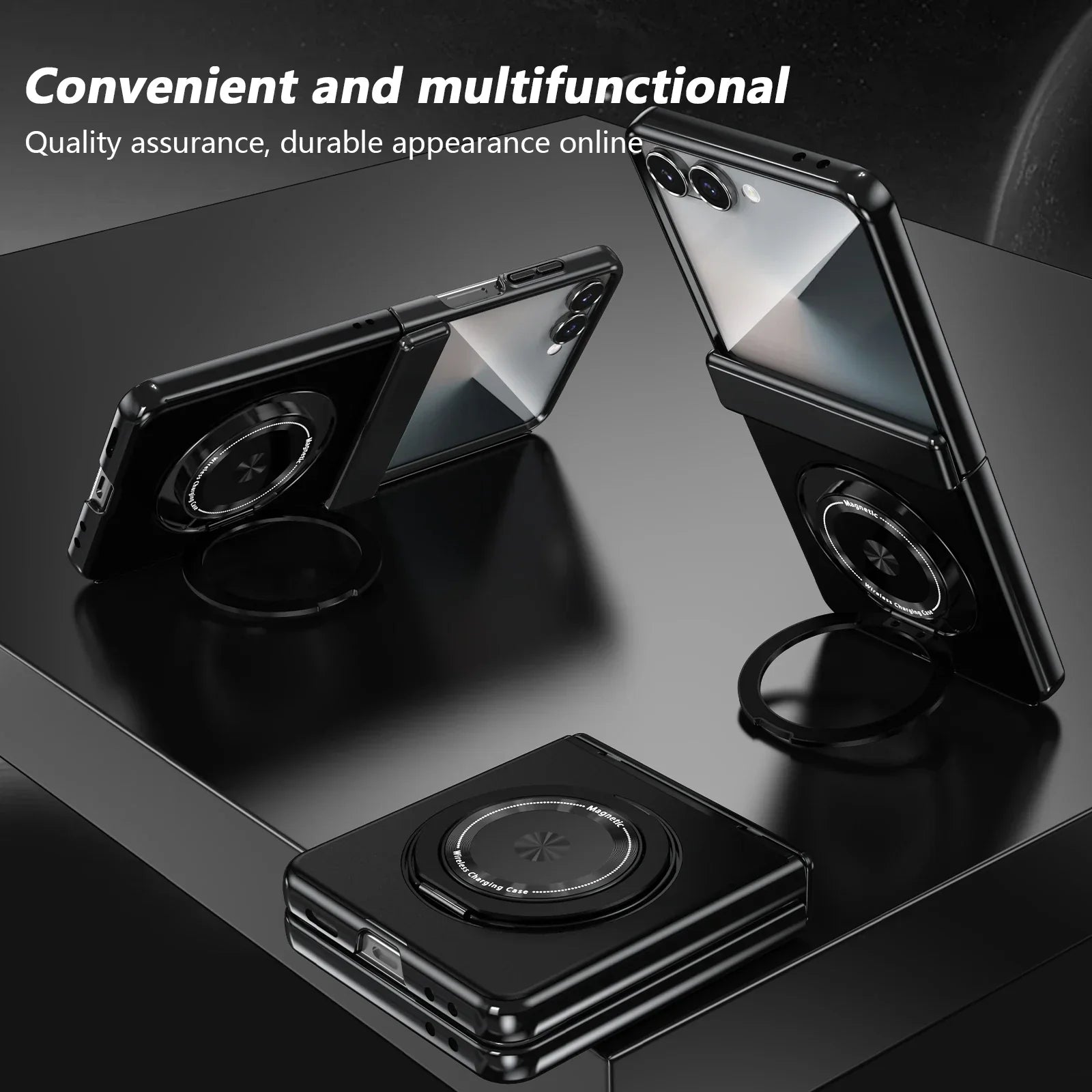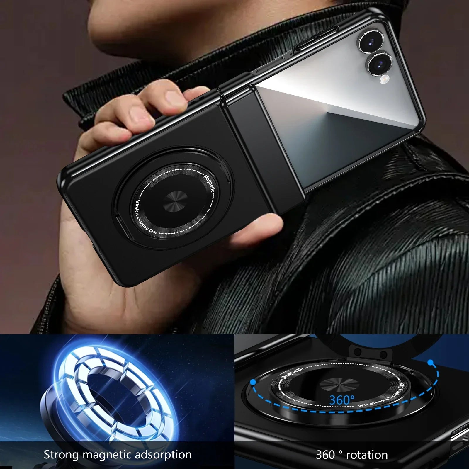 Z Flip 7 Leather Ring Case with Kickstand, Magnetic MagSafe, Tempered Glass Protector, Wireless Charging Compatible